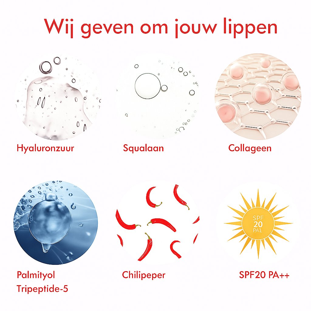Hyaluronzuur en collageen bouwen het natuurlijke volume van de lippen op, terwijl capsaïcine de warmte creëert die de lippen tijdelijk doet opzwellen voor een maximaal vol effect.
